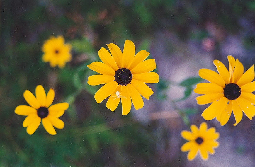 This native prairie biennial forms a rosette of leaves the first year, followed by flowers the second year. The flower of the Black-eyed Susan is a showy composite. Its like a daisy except it has yellow "petals" and a brown button. It is one of my personal favorites. The black-eyed Susan sits on a slender bristly stalk. It likes dry waste places where nothing much else will grow; often it can be spotted along the road side growing in sandy soil. State flower of Maryland.