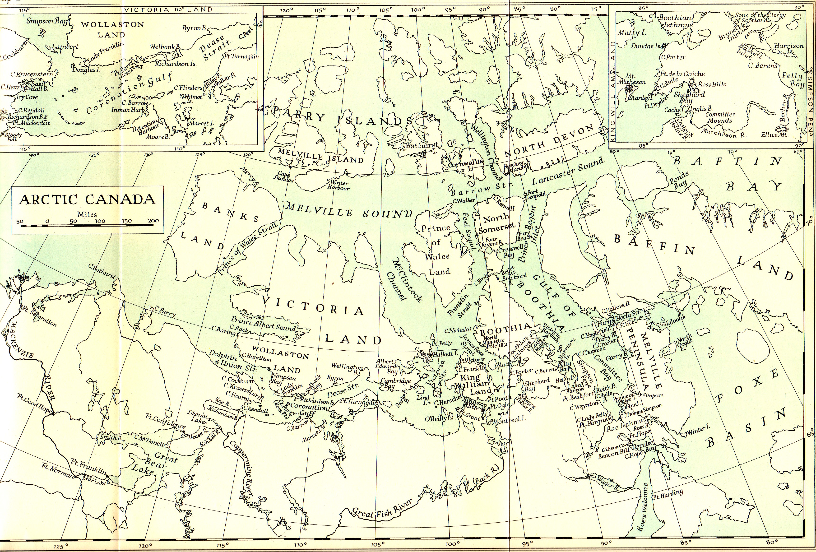 "... in the spring four sledge parties looked for Franklin. Ross and McClintock made the longest and most successful journey, between 15 May and 23 June, when they sledged along the north coast of Somerset Island and then down its west side, which had not yet been explored by Europeans. They found no trace of Franklin, but mapped about 150 nautical miles of shoreline."4