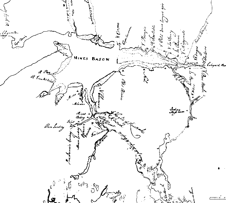 [7] Minas, I suggest, covers a large territory occupied by the French lying to the southwest of an usual body of water known as the Minas Basin: includes lands on the shores which stretch from Pereaux River, south, through the Canard and Habitant Rivers. Then, turning, running east; first, Grand Pré then, 20 miles along, to Piziquid. Grand Pré was the first of these Minas villages (maybe better described as farm clusters); it was settled in 1680. The originals founders might be referred to "The Two Pierres": Pierre Theriault and Pierre Melanson. These original families proceeded "independently of each other ..." [p. 24 of Thwaites' book, France in America, 7th vol. of 27, (Harper Brs., 1905); see also Savary's Supplement, History of the County of Annapolis, p. 14; see also Eaton's History, op. cit., p. 26. I should note, parenthetically, that Theriault's wife was Celine Landry.] Soon the inner southern banks of the Minas Basin, up its creeks, away from easy access by English vessels, were to be found the families headed by Jean Theriault, Martin Aucoin, Philippe Pinet, and Francois Lapierre (these last two having come directly from France). (See Eaton, p. 27.)
