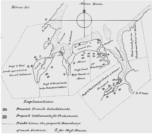 "Those people had been drawn to Nova Scotia by the offer of lands and implements and the rest of it; and the original idea of an initial one year's free victualing had been to tide them over until they could begin to producing something on their promised lands. The government had been unable to perform its side of the bargain by placing them on land where they could even make a beginning toward self-sufficiency. Halifax being the sort of place it was, the government was then under moral obligation to see to it that some means of support was available to the foreigners until it could fulfil its own principal undertakings to them."1This was not just a local problem. The question for the English authorities at London, who were obliged to turn to parliament for yet more funds, particularly pressing during the winter of 1752/53, was -- Why was it taking so long to get the new English settlements established in Nova Scotia? It was now going on four year since Edward Cornwallis, with 2,600 settlers was sent out in order to establish a stronger English presence in Nova Scotia, a presence which was to start with, "The Founding of Halifax." In the succeeding years through to 1752, as many settlers as were originally sent with Cornwallis were to arrive and be added to the population at Halifax. (See, "Foreign Protestants by the Shipload.") It was the intention of the English, as we have seen, at government expense2, to establish Protestant settlements throughout Nova Scotia in order to offset the French Catholic population, which had been the only European population in Nova Scotia for quite some period of time. (The Acadians had established themselves in the province 110 years earlier.) In addition to a major English fort and settlement at Chebucto (Halifax), settlements were to be established in outlying areas. Considered among the areas were: Minas, Whitehead, Baie Verte and La Have.3