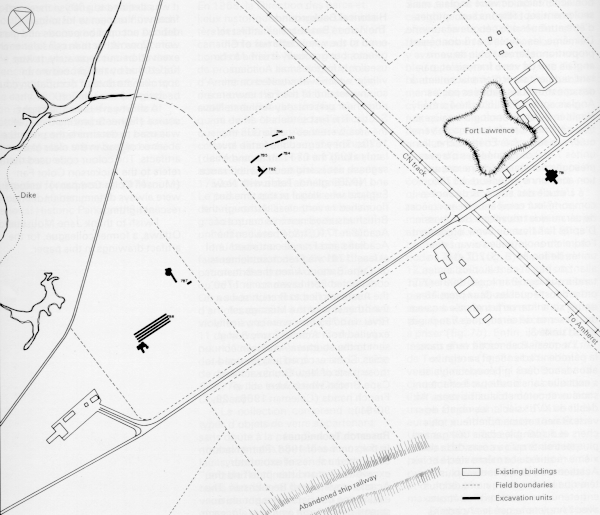 | Archaeological drawing showing position of Fort Lawrence, on the ground relative to modern day structures. [Taken from Canadian Historic Sites, No. 13 (Ottawa: 1975).]. |