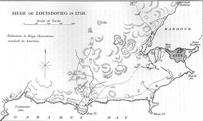 The Shores, Southwest of Louisbourg, circa 1758.1 French Gun Emplacements: Fresh Water Cove: Flat Point: White Point: C. - One SwivelD. - Two SwivelsE. - Two Six PoundersF. - One Twenty Pounder & Two Six Pounders G. - One Seven-inch MortarH. - Two SwivelsI. - Two Six PoundersK. - Two Six PoundersN. - Two Twelve Pounders O. - Two Six PoundersP. - Two Twenty-four PoundersQ. - Two Six PoundersR. - Two Twelve Pounders