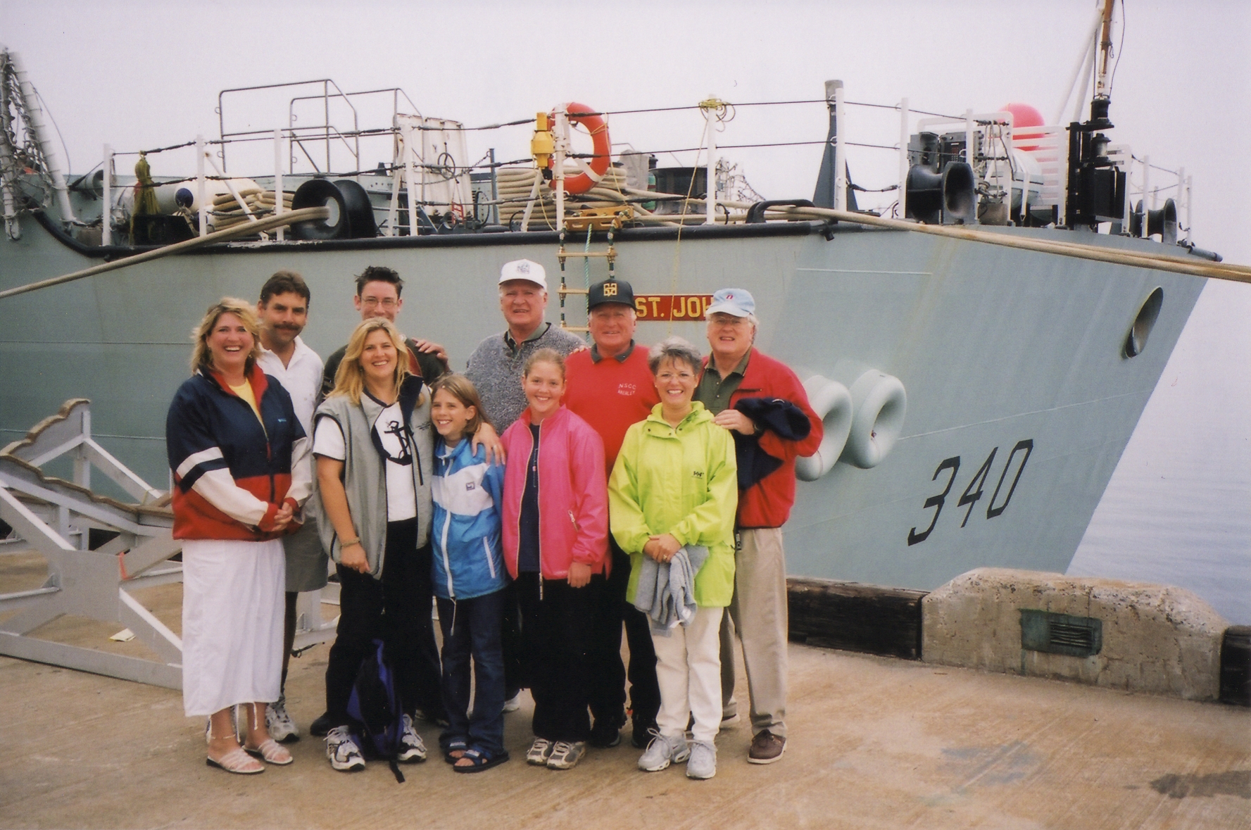One of the memorable events for 2001, was the tour and cruise that we received on the Canadian Warship, HMCS St. John's. This, was with the compliments of the Canadian Navy, due to the fact that my son-in-law, Martin, is a member of it and, at the time, part of her crew. I have looked the St. John's up; she was built beginning in 1994 and commissioned in 1996. She is 440 feet in length and a beam of 54 feet, and a draft of 23 feet. Marty was a marine engineer and worked with the propulsion units of the vessel: being one diesel engine and two gas turbines which can drive her through the waters, where called for, at a speed of 30 knots. She is, as mentioned, a war vessel, and as such has substantial armament. Twenty-four torpedoes; sixteen Sea Sparrows being short-range anti-aircraft and anti-missiles, known as SAMs; eight Sea-skimming cruise missiles (Harpoon); and, of course, machine guns mounted here and there on the decks. So too, is a helicopter tucked in its hanger towards the stern. One would not really want to lock horns with this class of navel vessel. Canadians are to be proud of our Canadian navy and the men in service.