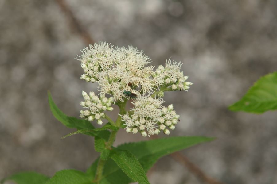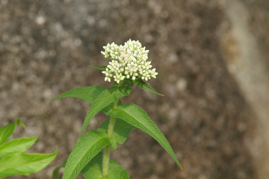 It is easily discovered. The white flower heads are up to five inches across; the plants themselves up to five feet tall. The lanceolate leaves are opposite and united at the base so as to completely surround the stem. They like wet places along the shores of lakes, bogs and streams. They flower in late summer. Audubon gives the origin of its name: because the stem seemingly grows straight through the leaves, it was thought by the ancient doctors to be good when setting bones. The leaves were wrapped around the splints to assist in the healing process. More generally, it is a plant highly valued for its medicinal properties. I quote Audubon: "The dried leaves have also been used to make a tonic, boneset tea,thought effective in treating colds, coughs, and constipation."
