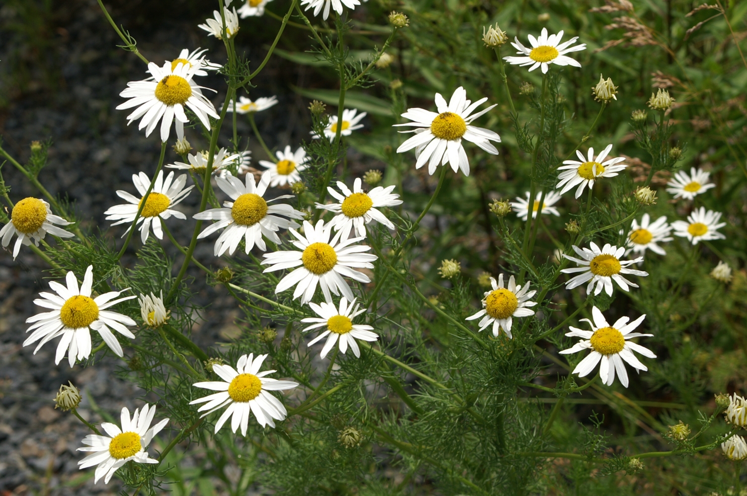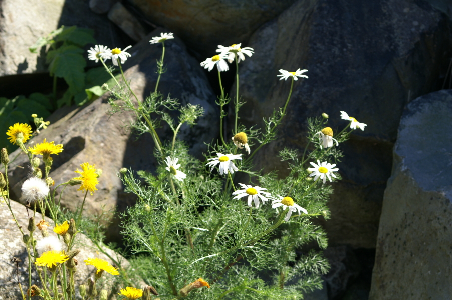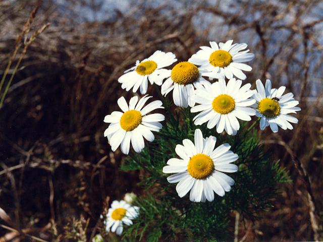 This alien from Europe looks like your typical daisy (sunflower family) with 10 to 20 white petals (ray florets) and a yellow disk at the centre. The leaves are another matter; they are dissected and fern like with an unpleasant odor and acrid taste. One will begin to spot them in June and will be found until the fall when the frost takes them. They like waste places and the roadside ditches usually close to the seasides of Nova Scotia.